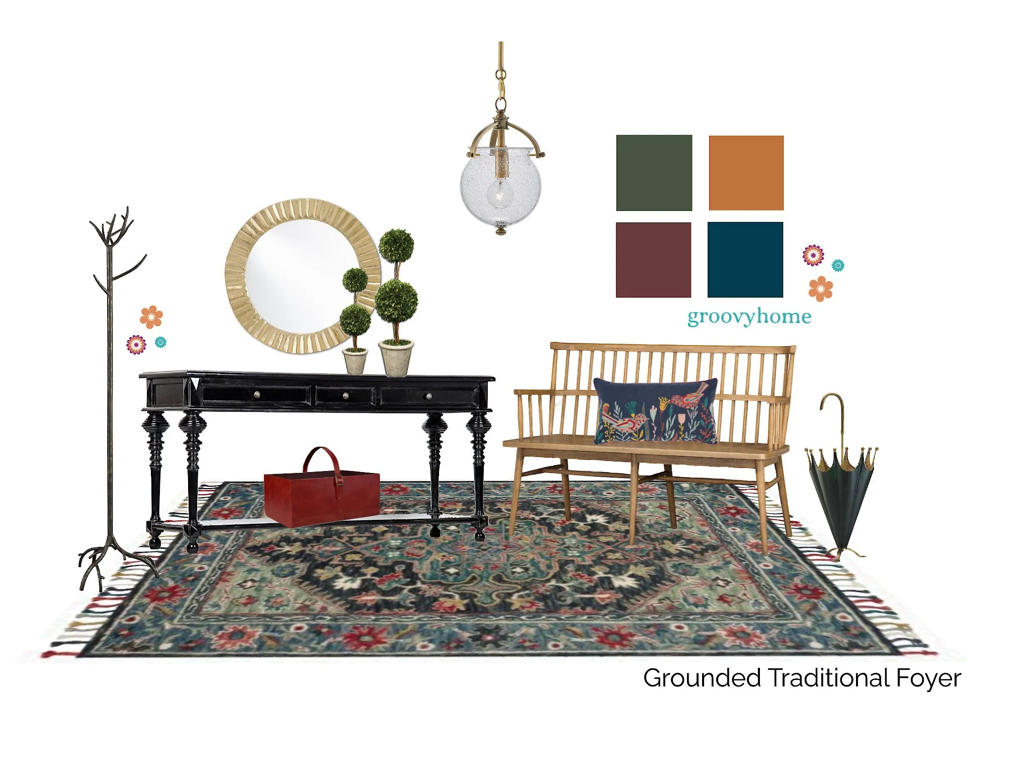I created this Grounded Traditional furnishings concept just for you, as an example companion to your palette. I think it would make a beautiful first impression in a foyer.