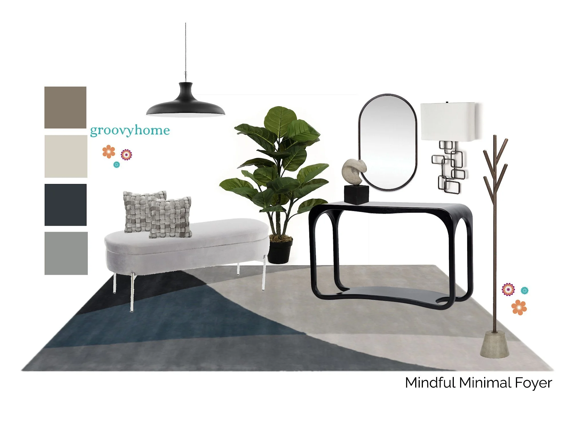 I created this Mindful Minimal furnishings concept just for you, as an example companion to your palette. I think it would make a beautiful first impression in a foyer.